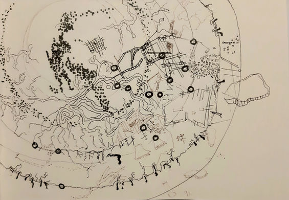 "Maps for the Future" is a poetic cartography that invites viewers to reimagine the city through layers of color, form, and fantasy. Using a process of saltwater and ink, territories form and create new landmasses. The marks—both deliberate and weathered—suggest not just geography, but memory, movement, and human presence. Rather than charting fixed routes, this map opens a space for imagination. It is a lyrical meditation on how we inhabit, remember, and reinvent the places we call home.